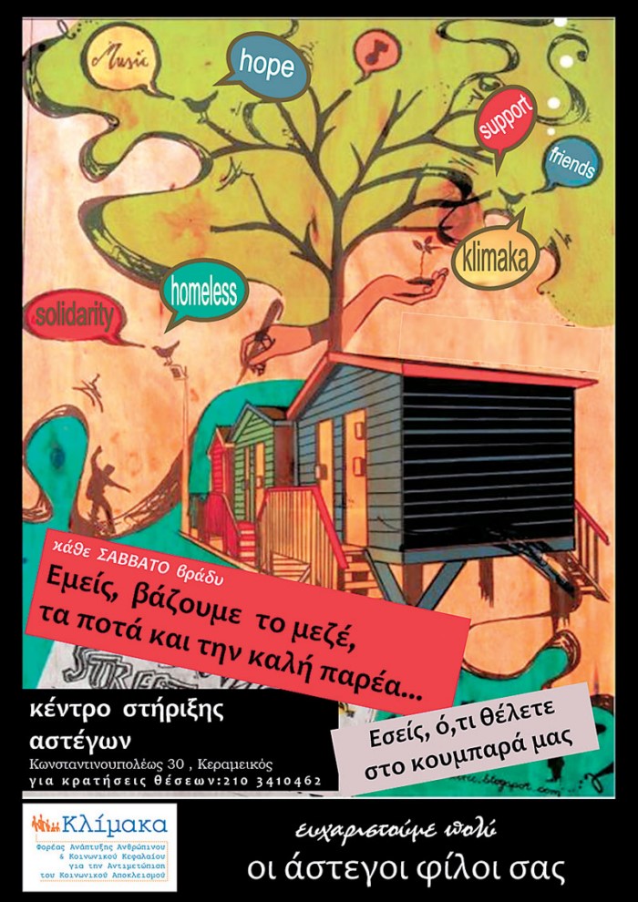 Δίπλα στις γραμμές του τρένου στον Κεραμεικό, στο Κέντρο Ημέρας Αστέγων της ΜΚΟ «Κλίμακα», κάθε Σαββατόβραδο, ο χώρος μεταμορφώνεται σε χώρο διασκέδασης και κοινωνικοποίησης. Οι άστεγοι «βάζουν» τα ποτά, τους μεζέδες, τη μουσική και την παρέα και το μόνο που ζητούν από τους πελάτες είναι να φέρουν από το σπίτι την καλή τους διάθεση. Οσο για τις τιμές… Ο,τι έχει ευχαρίστηση ο κάθε πελάτης και ό,τι του επιτρέπει η τσέπη του. Τα χρήματα πηγαίνουν απευθείας στους αστέγους, χωρίς την παραμικρή συμμετοχή της οργάνωσης.
