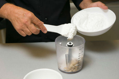 1. Βάζουμε στον κάδο του μπλέντερ ή του μούλτι τα αμύγδαλα, την άχνη και ένα μέρος από το ασπράδι αβγού της συνταγής μας.