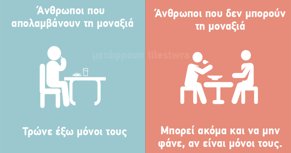 Υπάρχουν όμως άνθρωποι που έχουν μια ιδιαίτερη προτίμηση στο να μένουν μόνοι, όχι να απομονώνονται από τους πάντες και από τα πάντα, αλλά να απολαμβάνουν χρόνο με τον εαυτό τους. Υπάρχουν πάλι οι άνθρωποι που είναι τόσο εξωστρεφείς που δεν αντέχουν να μην βρίσκονται μέσα σε μια παρέα.