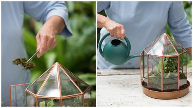 – Όταν φτιάξετε μια επίπεδη επιφάνεια μπορείτε να αποφασίσετε που θέλετε να βάλετε τα φυτά. Φυτέψτε τα φυτά, και χρησιμοποιήστε ό, τι θέλετε για να διακοσμήσετε την γυάλα.