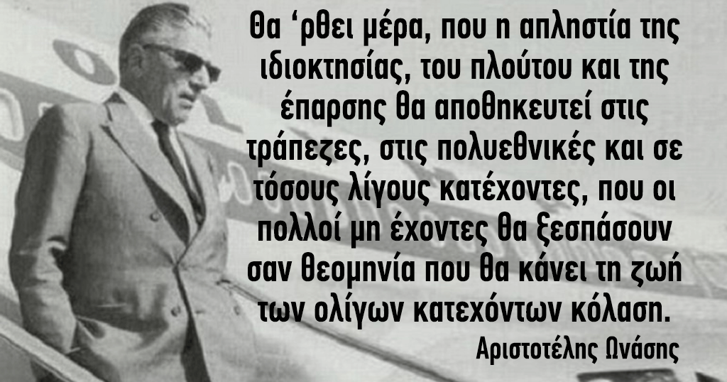 * “Θα ‘ρθει μία μέρα, που η απληστία της ιδιοκτησίας, του πλούτου και της έπαρσης, θα αποθηκευτεί στις Τράπεζες, στις πολυεθνικές και σε τόσο λίγους, που οι πολλοί μη κατέχοντες, θα ξεσπάσουν σαν θεομηνία που θα κάνει τη ζωή των ολίγων κατεχόντων κόλαση”