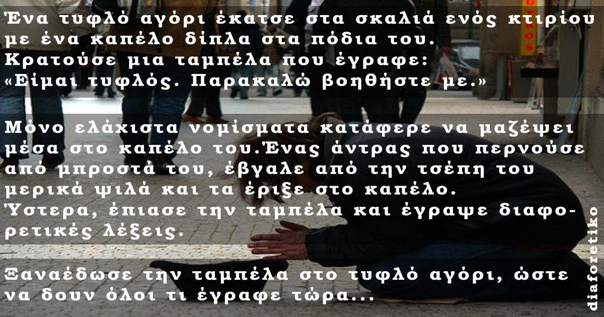 Ένα τυφλό αγόρι είχε καθίσει στα σκαλιά ενός κτιρίου με ένα καπέλο κοντά στα πόδια του. Η ταμπέλα που κρατούσε στα χέρια του έλεγε “Είμαι τυφλός. Παρακαλώ βοηθήστε με.”