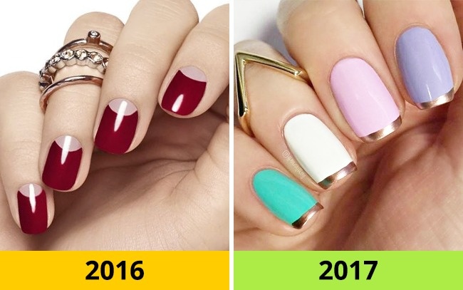 Το λεγόμενο μανικιούρ “φεγγάρι”, που η βάση του νυχιού έχει διαφορετικό χρώμα από το υπόλοιπο νύχι έκανε θραύση το 2016. Το 2017, θα αντικατασταθεί από το πολύχρωμο γαλλικό μανικιούρ.